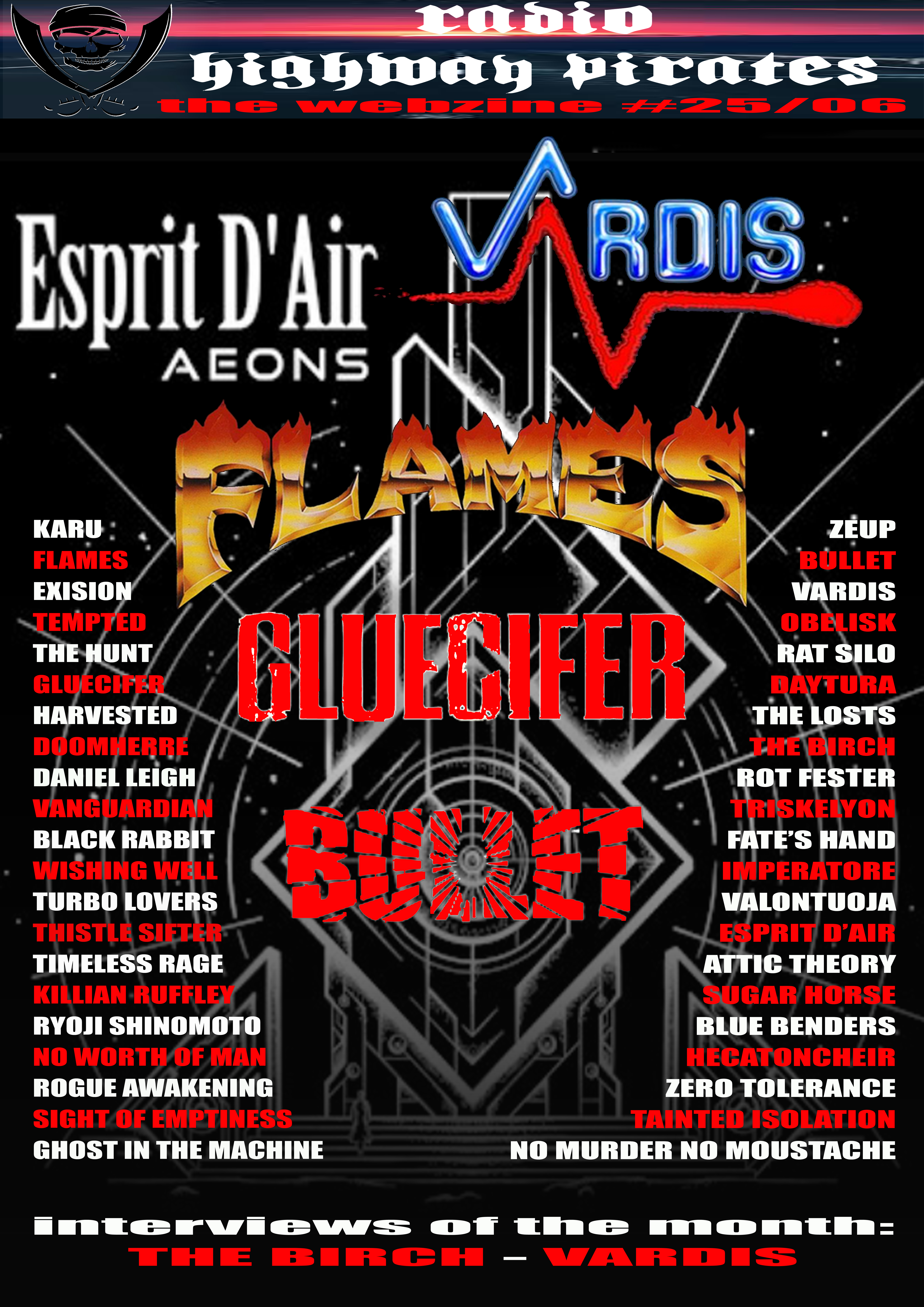 THE WIZARD (Fantasy Stories) – ROT FESTER (Sweden/Death Metal) – OBELISK (Scotland/Metalcore) – SUGAR HORSE (England/Experimental Rock) – BULLET (Sweden/Heavy Metal) – ATTIC THEORY (England/Alternative Rock) – THE BIRCH (Germany/Psychedelic Rock) – HECATONCHEIR (Slovakia/Black Metal) – BLUE BENDERS (Sweden/Blues) – ZERO TOLERANCE (Canada/Thrash Metal) – ESPRIT D’AIR (Japan/Alternative Metal) – VARDIS (England/Heavy Metal) – TRISKELYON (Canada/Thrash Metal) – TAINTED ISOLATION (USA/Industrial) – DAYTURA (England/Classic Rock) – RAT SILO (Canada/Alternative Rock) – FATE’S HAND (Australia/Power Metal) – VALONTUOJA (Finland/Black Metal) – THE LOSTS (France/Heavy Metal) – ZEUP (Denmark/Stoner Rock) – LIONHEART (USA/Hardcore) – Flames (Greece/Thrash Metal) – NO MURDER NO MOUSTACHE (Wales/Folk Punk) – RADIO HIGHWAY PIRATES THE WEBZINE #25/06