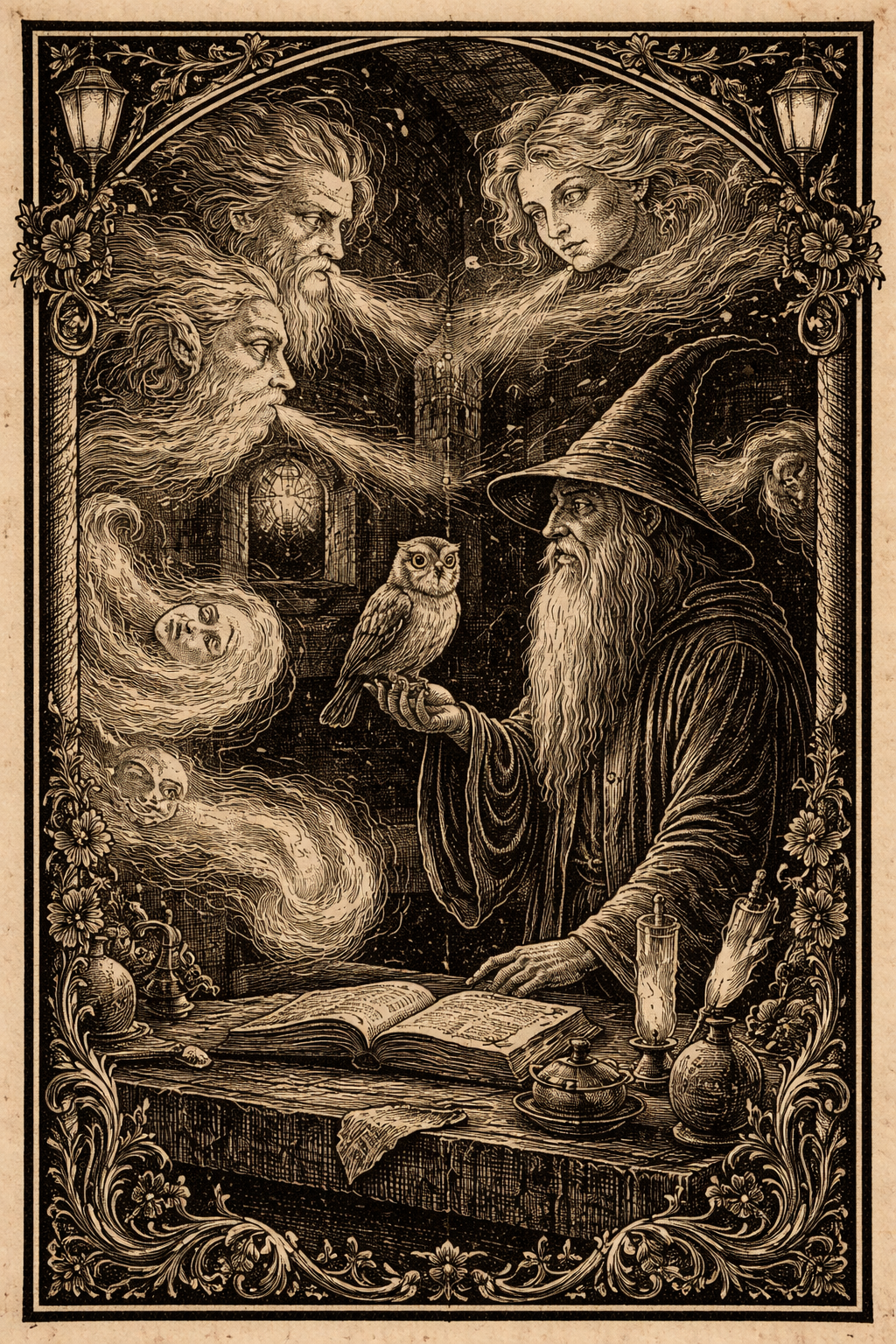 Once upon a time, in a tower wrapped in ivy and moonlight, there lived an old and wise wizard whose beard flowed like silver river-water down his chest.